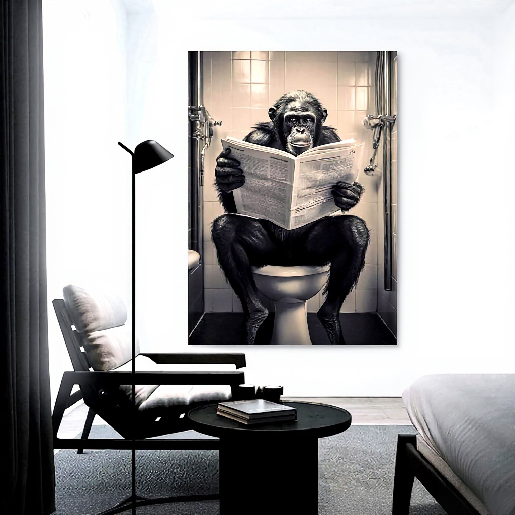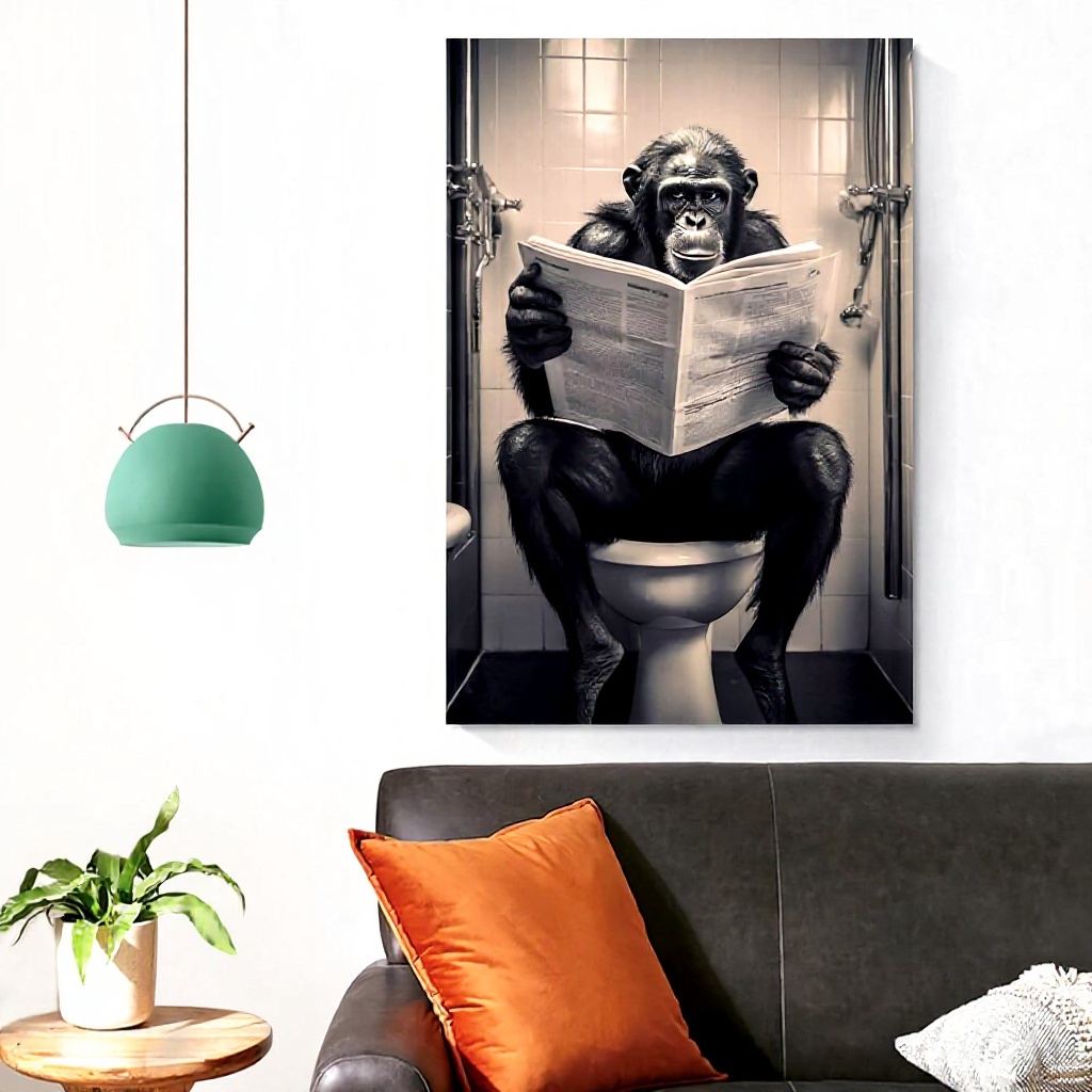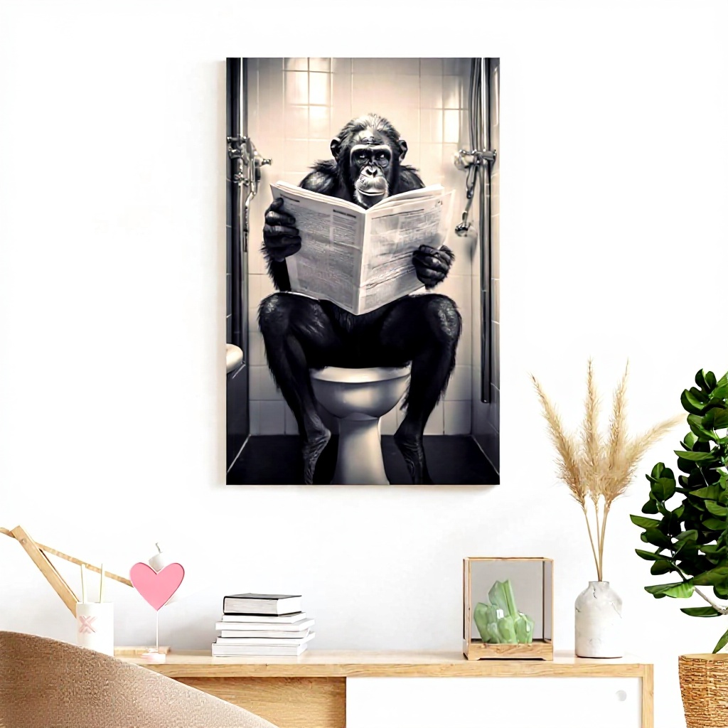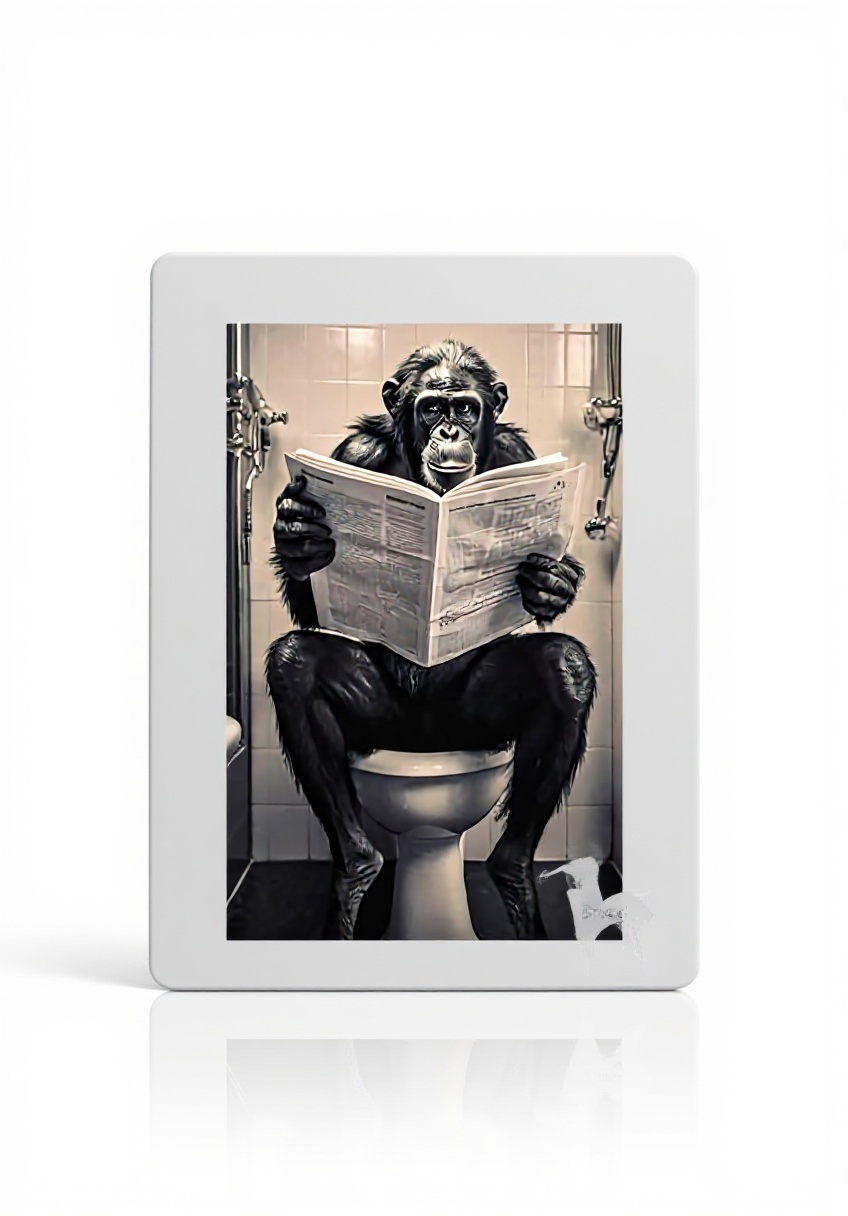 Cette affiche unique met en scène un bonobo chimpanzé assis sur des toilettes en train de lire un journal, créant une ambiance humoristique et insolite. Imprimée sur toile de haute qualité avec des encres écologiques résistantes à l’eau et aux UV, elle assure une excellente durabilité et des couleurs vives qui ne se décolorent pas dans le temps.