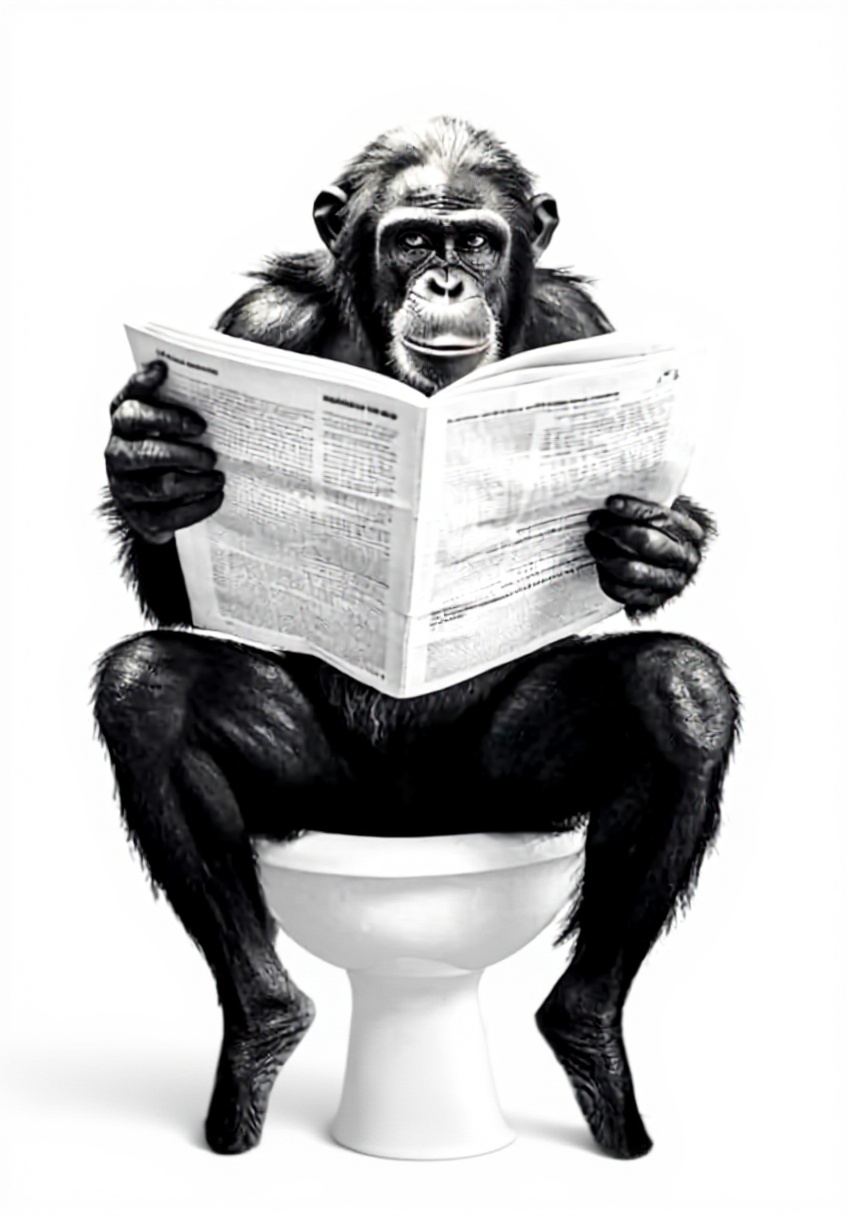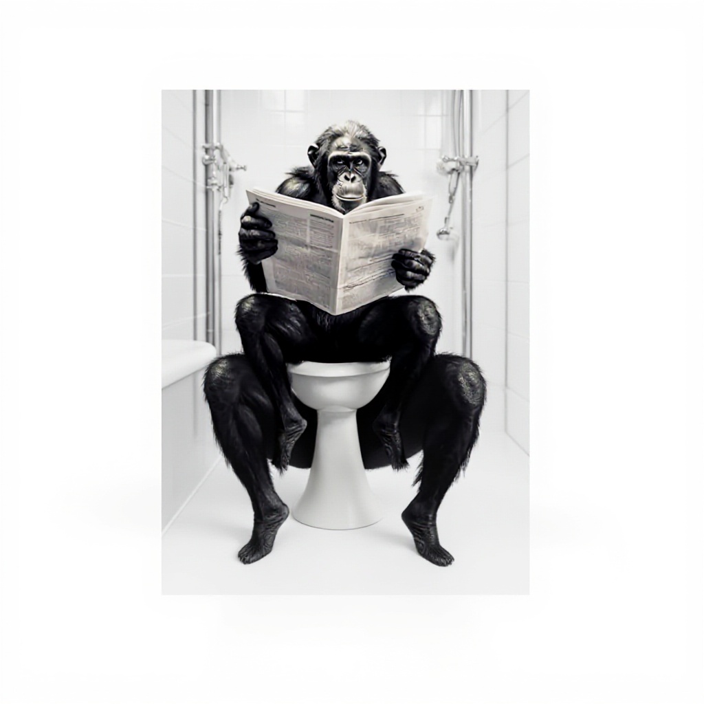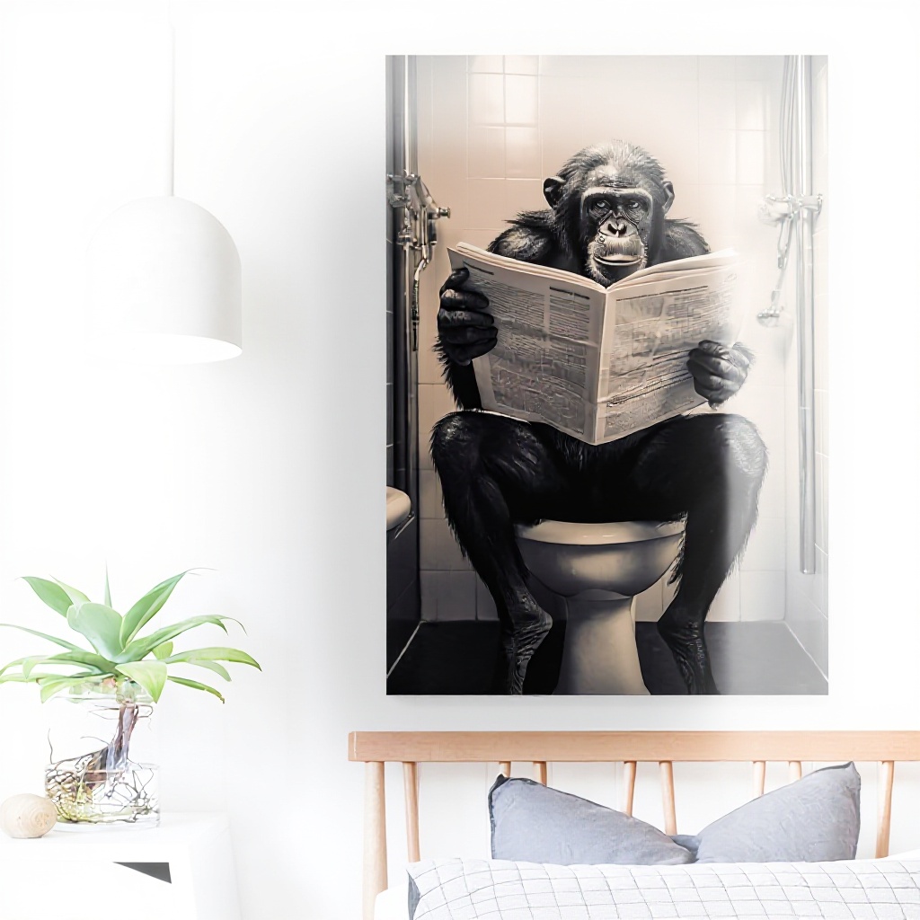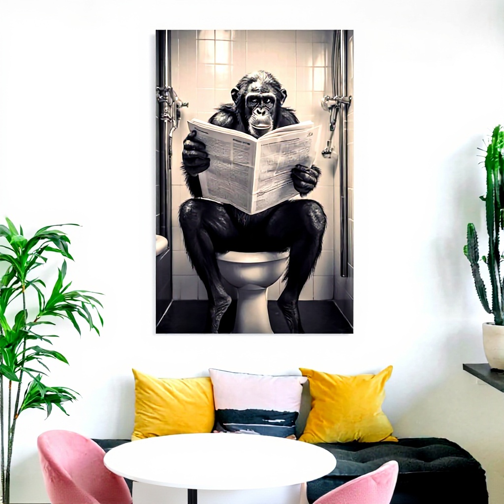 Cette affiche unique met en scène un bonobo chimpanzé assis sur des toilettes en train de lire un journal, créant une ambiance humoristique et insolite. Imprimée sur toile de haute qualité avec des encres écologiques résistantes à l’eau et aux UV, elle assure une excellente durabilité et des couleurs vives qui ne se décolorent pas dans le temps.