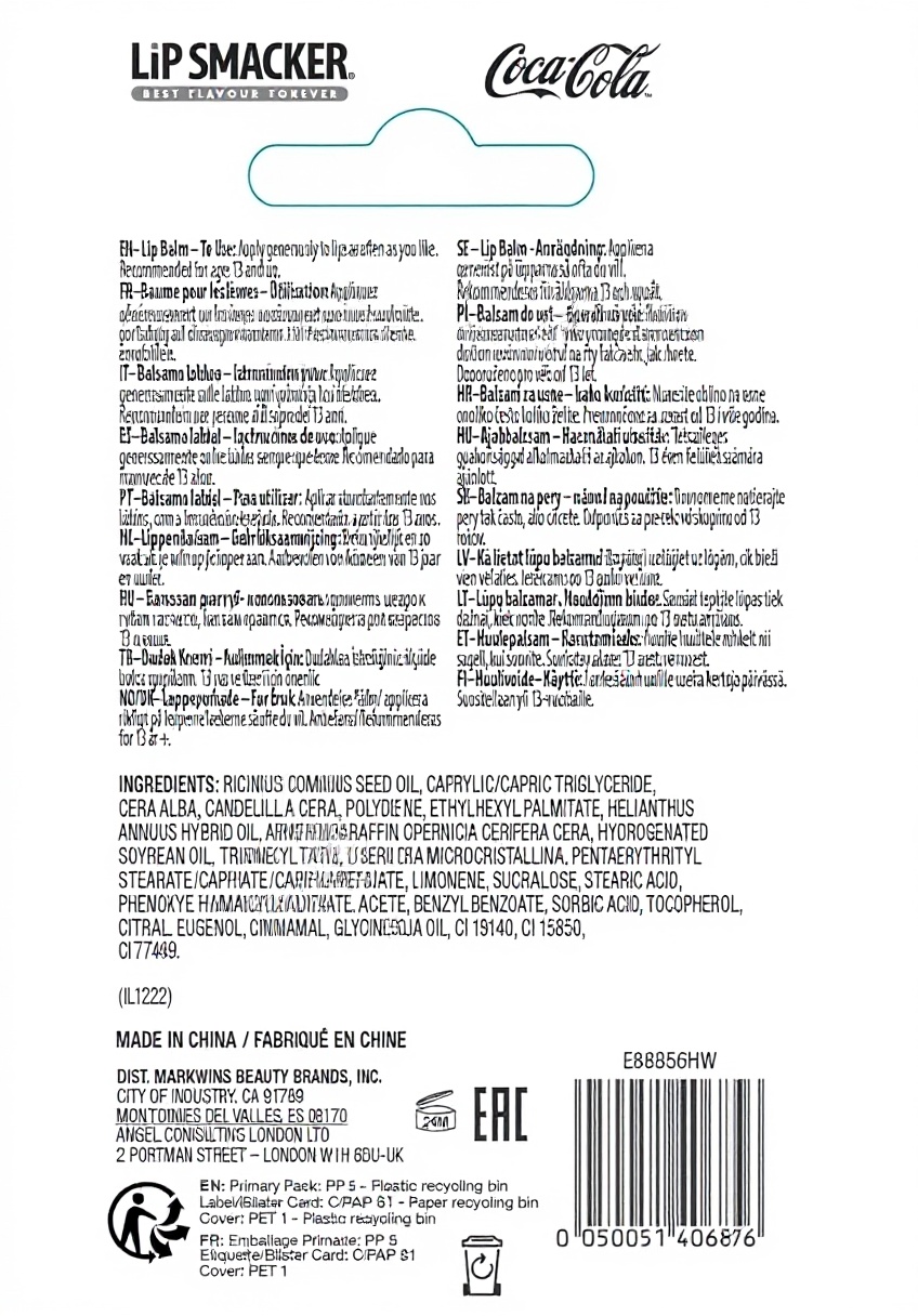 Dimensions : 7 x 1,5 x 13,5 cm pour un poids de 4 grammes. Fabriqué par Lip Smacker en Italie, ce modèle E88856H est disponible en plusieurs versions et coloris, incluant des options comme Coca-Cola, Fanta ou Sprite.