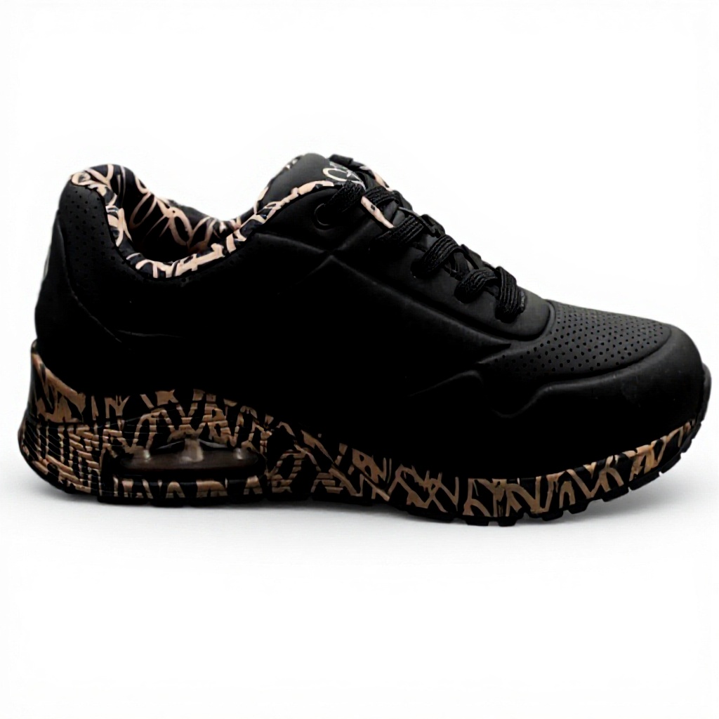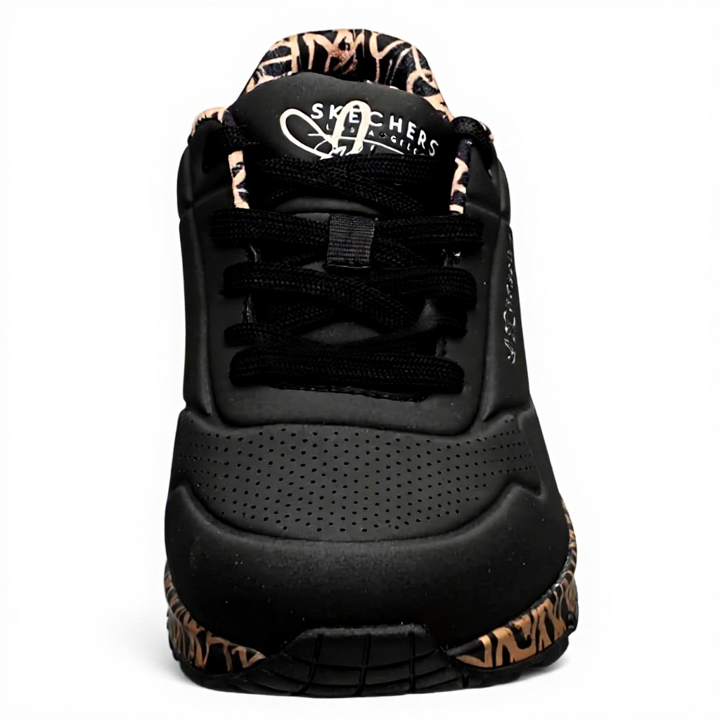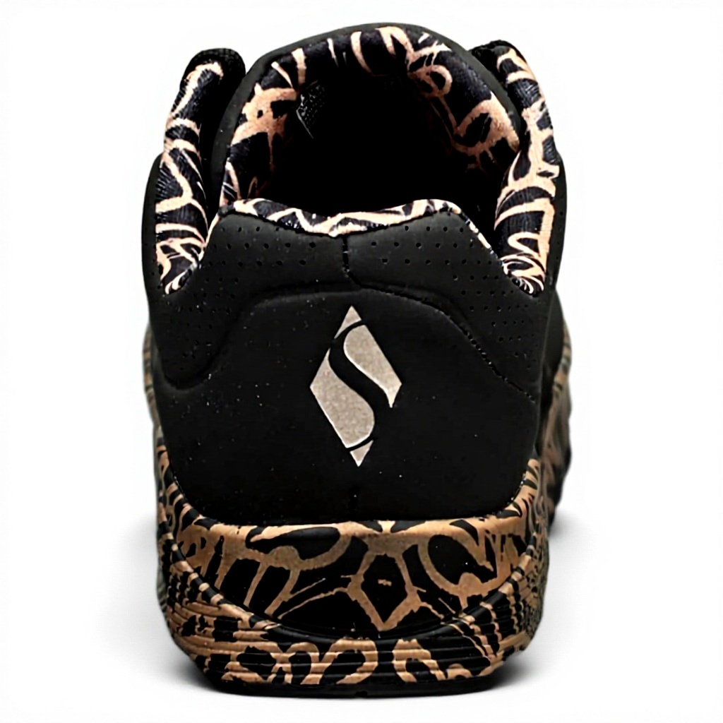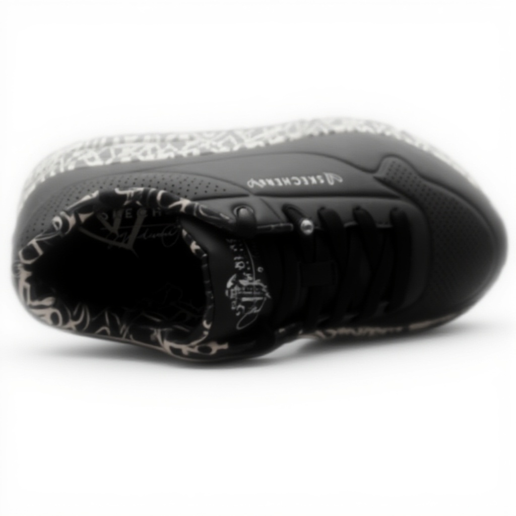 Disponibles en tailles EU de 24 à 48.5, avec des options de couleur comme Blanc Durabuck avec impression rose or, Noir Durabuck à finition multicolore ou rose or, et Blanc uni. Poids d’environ 2 kg, dimensions 32,51 x 21,84 x 12,19 cm. Modèle 155400, fabriqué par Skechers, conçu spécifiquement pour un usage masculin.