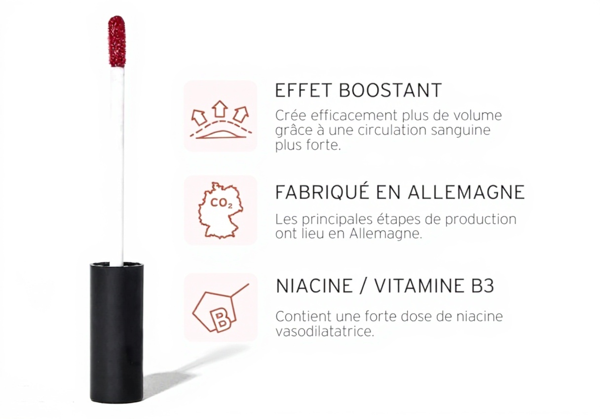 • Augmente le volume des lèvres grâce à la niacine et au peptide NUTRA