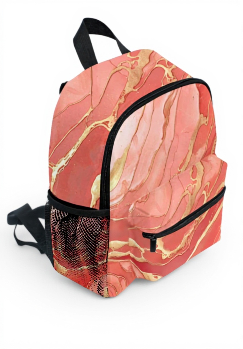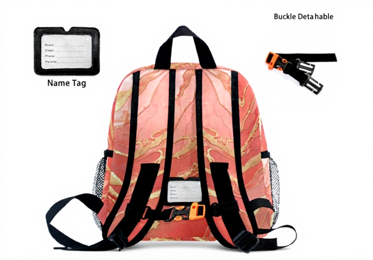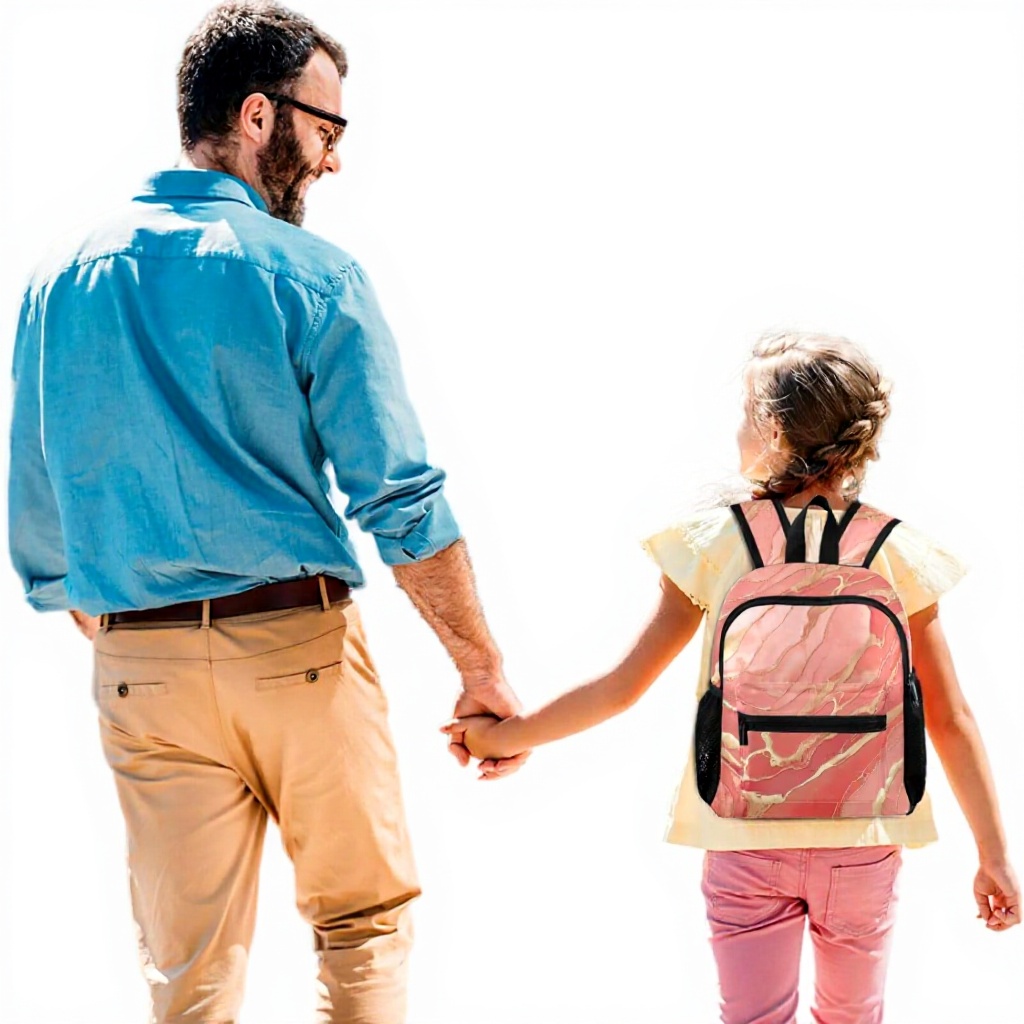 Ce sac à dos se distingue par son design élégant avec impression de granit de marbre rose, offrant un look unique et attrayant pour les enfants. Fabriqué en polyester résistant de haute qualité, il combine durabilité et légèreté. Les bretelles larges réglables et le dos rembourré assurent un port confortable, tandis que la ceinture pectorale ajustable stabilise la charge pendant les déplacements.