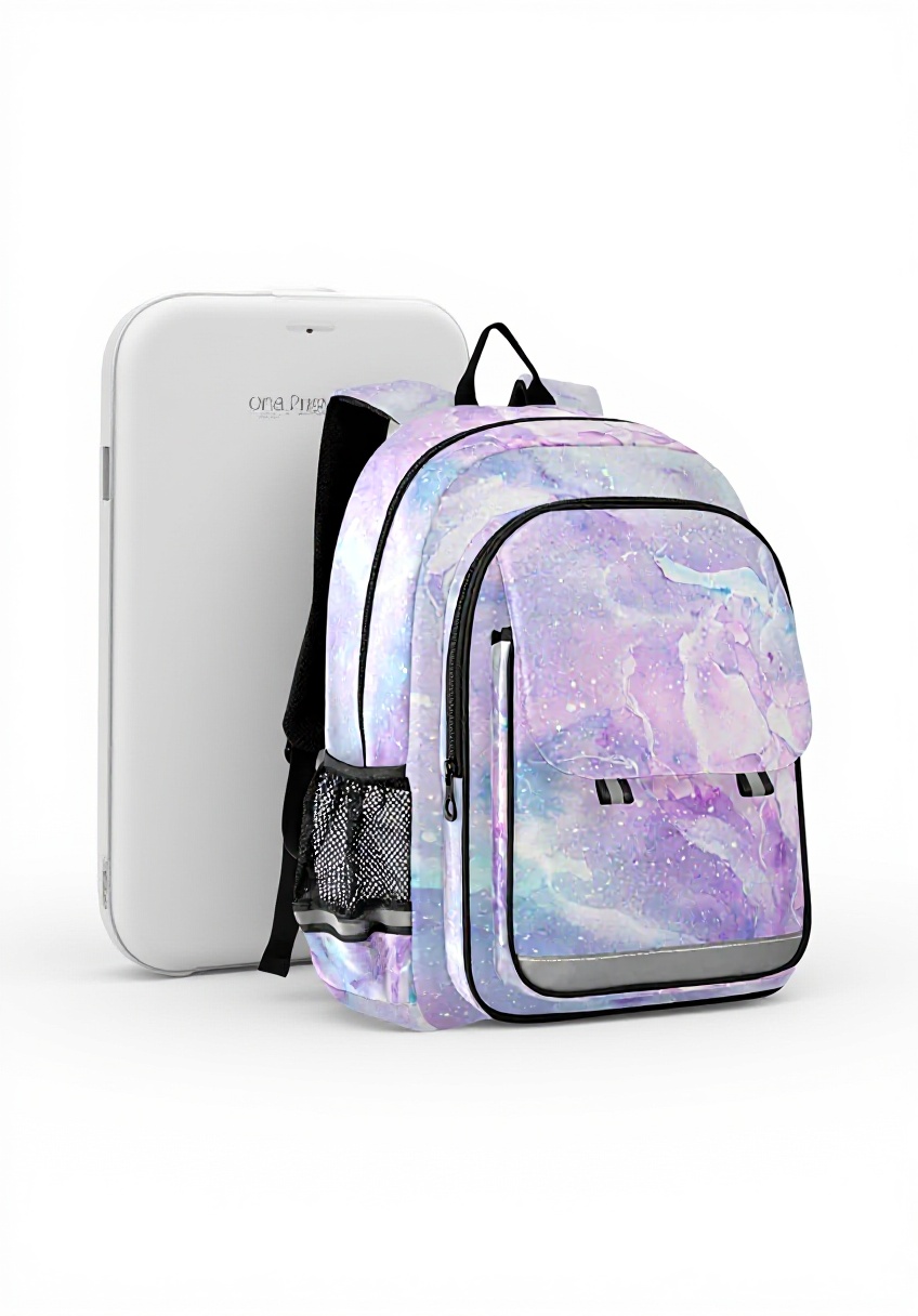 Ce sac à dos se distingue par son design unique en cuivre marbré granit, fabriqué en tissu titane de haute qualité pour une résistance aux froissements et à l’usure. Il intègre des bandes réfléchissantes pour une sécurité accrue et un système de port confortable avec bretelles larges et coussin dorsal épais.