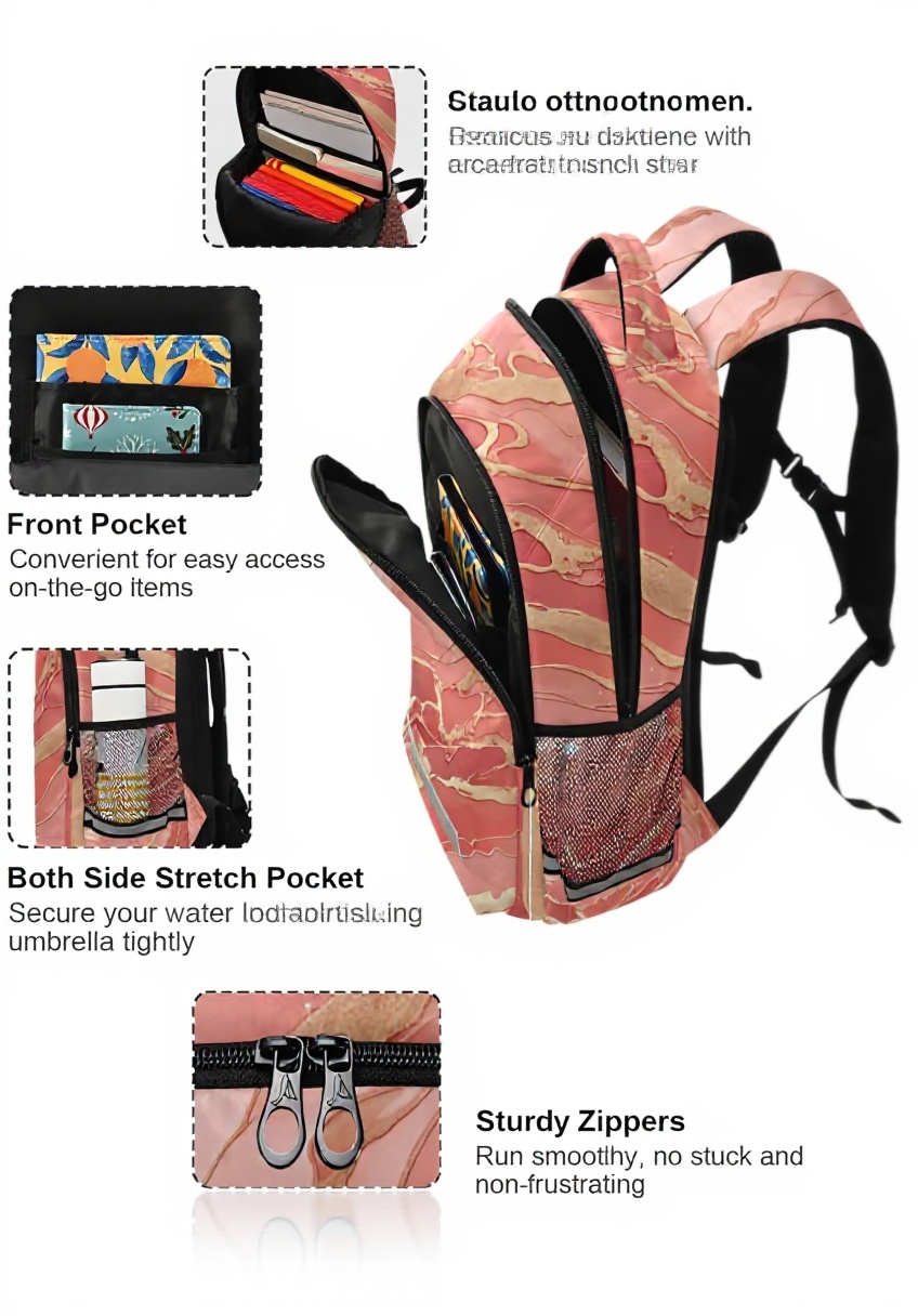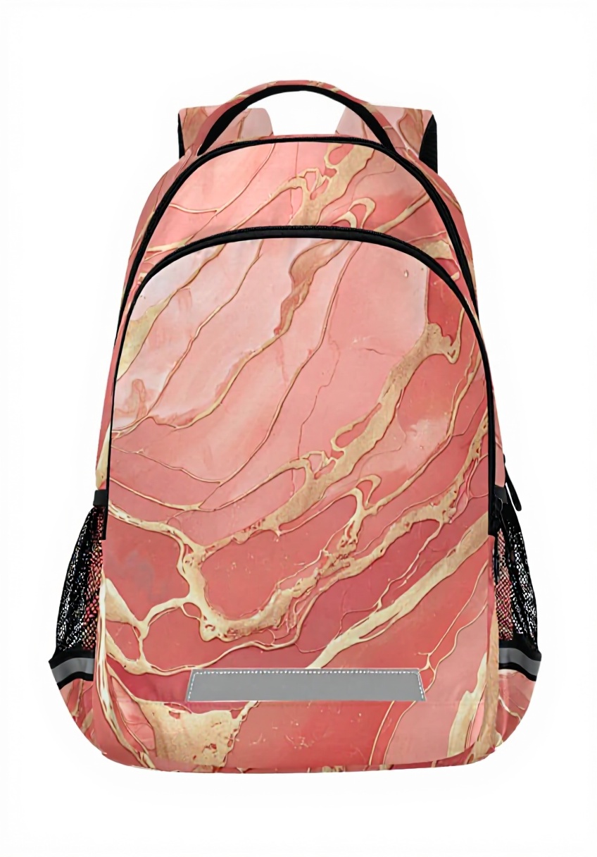 Ce sac à dos se distingue par son design unique avec impression de granit et marbre rose, offrant un style à la fois élégant et accrocheur. Fabriqué en polyester de haute qualité résistant à la déchirure, il est léger, durable et facile à nettoyer. Les bretelles réglables et rembourrées ainsi que le dos rembourré garantissent un port confortable, tandis que les bandes réfléchissantes améliorent la sécurité lors des déplacements.