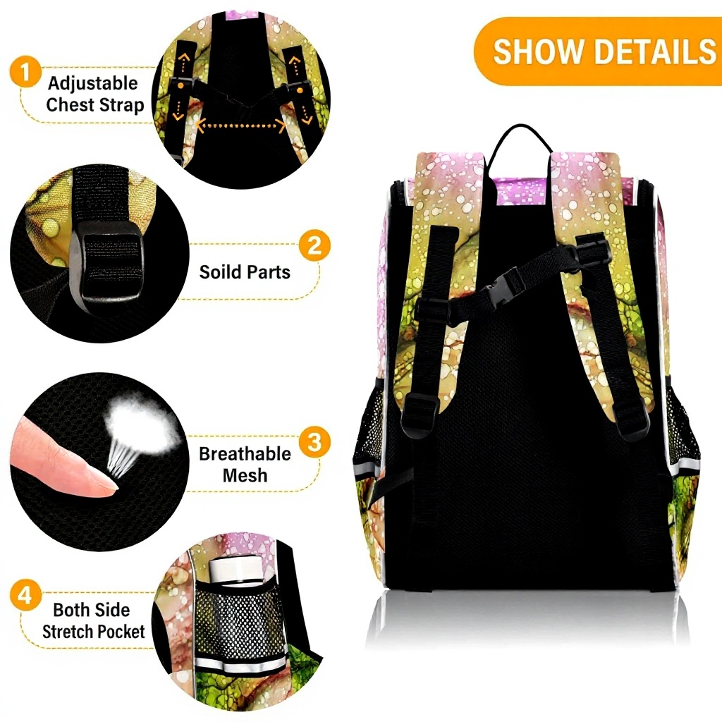 Ce sac à dos Vnurnrn se distingue par son design unique en marbre et granit avec des motifs arc-en-ciel, alliant esthétique et robustesse. Fabriqué en tissu de titane durable, il résiste à l’usure et aux déchirures, tout en étant respectueux de l’environnement. Les bandes réfléchissantes intégrées augmentent la sécurité lors des déplacements en conditions de faible luminosité.