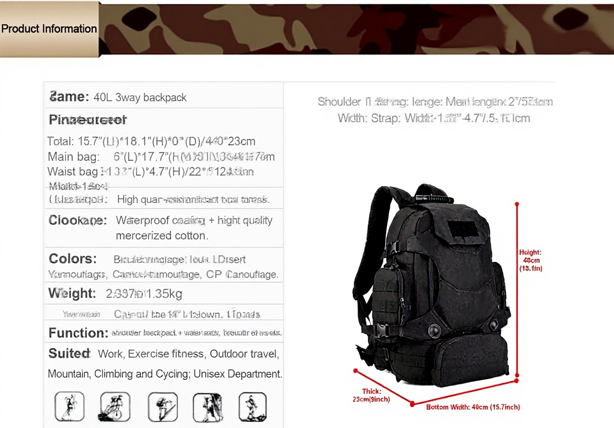 Ce sac à dos tactique de 40 litres est conçu en nylon 900D Oxford résistant à l’eau, offrant une excellente imperméabilité et une grande résistance à l’usure. Le système MOLLE permet une expansion modulaire pour adapter votre équipement selon vos besoins. La poche taille amovible et le patch Velcro personnalisable complètent ses fonctionnalités pratiques.