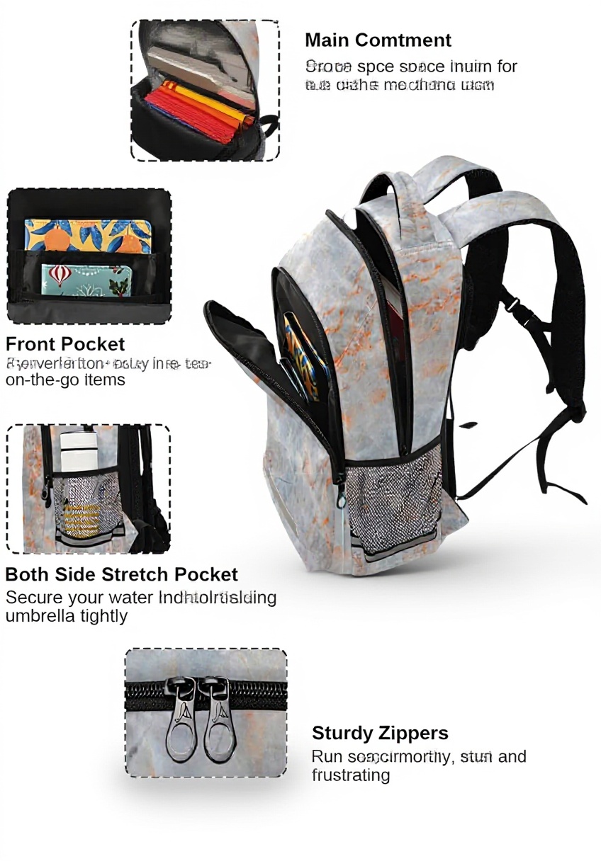 Ce sac à dos se distingue par son design unique associant des motifs marbre granit à des finitions cuivre métallique. Fabriqué en sergé de qualité supérieure et ceinture tissée avec sac en filet, il offre à la fois légèreté et durabilité. Son style décontracté s’adapte parfaitement aux besoins des enfants tout en assurant une tenue droite et rigide même lorsqu’il est vide.
