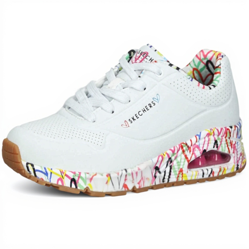 Disponibles en tailles EU de 24 à 48.5, avec des options de couleur incluant Blanc, Black Durabuck avec détails rose or ou multicolores. Poids : 2 kg, dimensions : 32,51 x 21,84 x 12,19 cm. Modèle : 155400, fabriqué par Skechers.