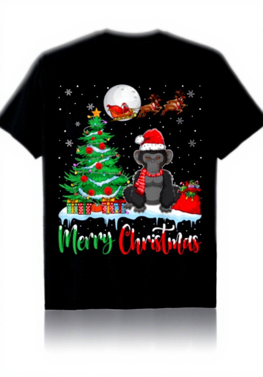 Ce t-shirt présente un design unique avec un bonobo espiègle portant un chapeau de Père Noël et entouré de guirlandes lumineuses, créant une ambiance festive. Fabriqué en coton léger pour un confort optimal, il offre une coupe classique avec des manches à double couture et un ourlet renforcé pour une durabilité accrue.