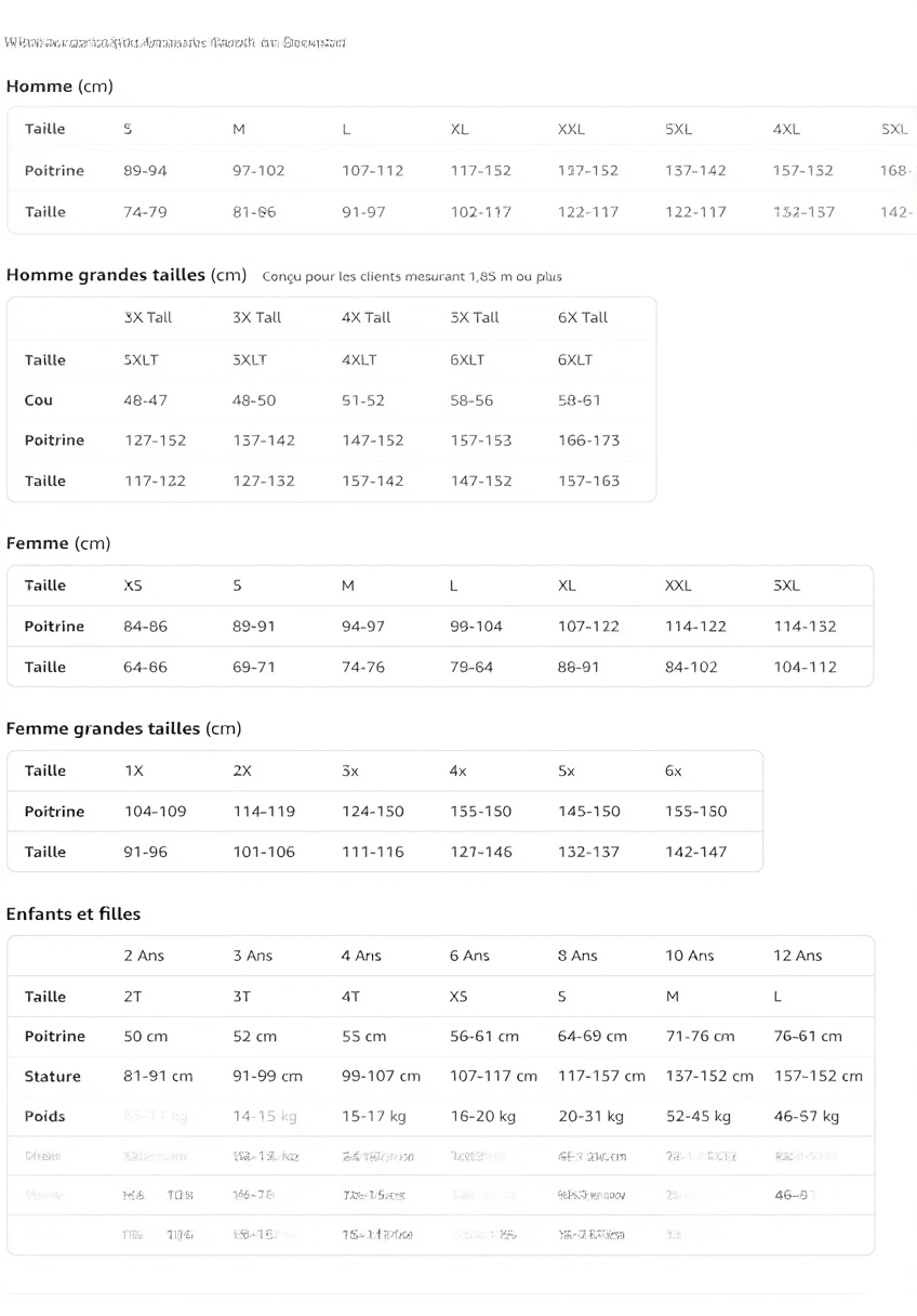 Le t-shirt est disponible en tailles standard et grandes tailles pour hommes, femmes et enfants, allant du XS au 6XL, ainsi qu’en versions Tall. Les coloris incluent noir, bleu marine, rouge, marron, chiné foncé, bleu chiné, violet et bleu royal. Poids : 136 g. Dimensions du colis : 25,4 x 20,32 x 2,54 cm.