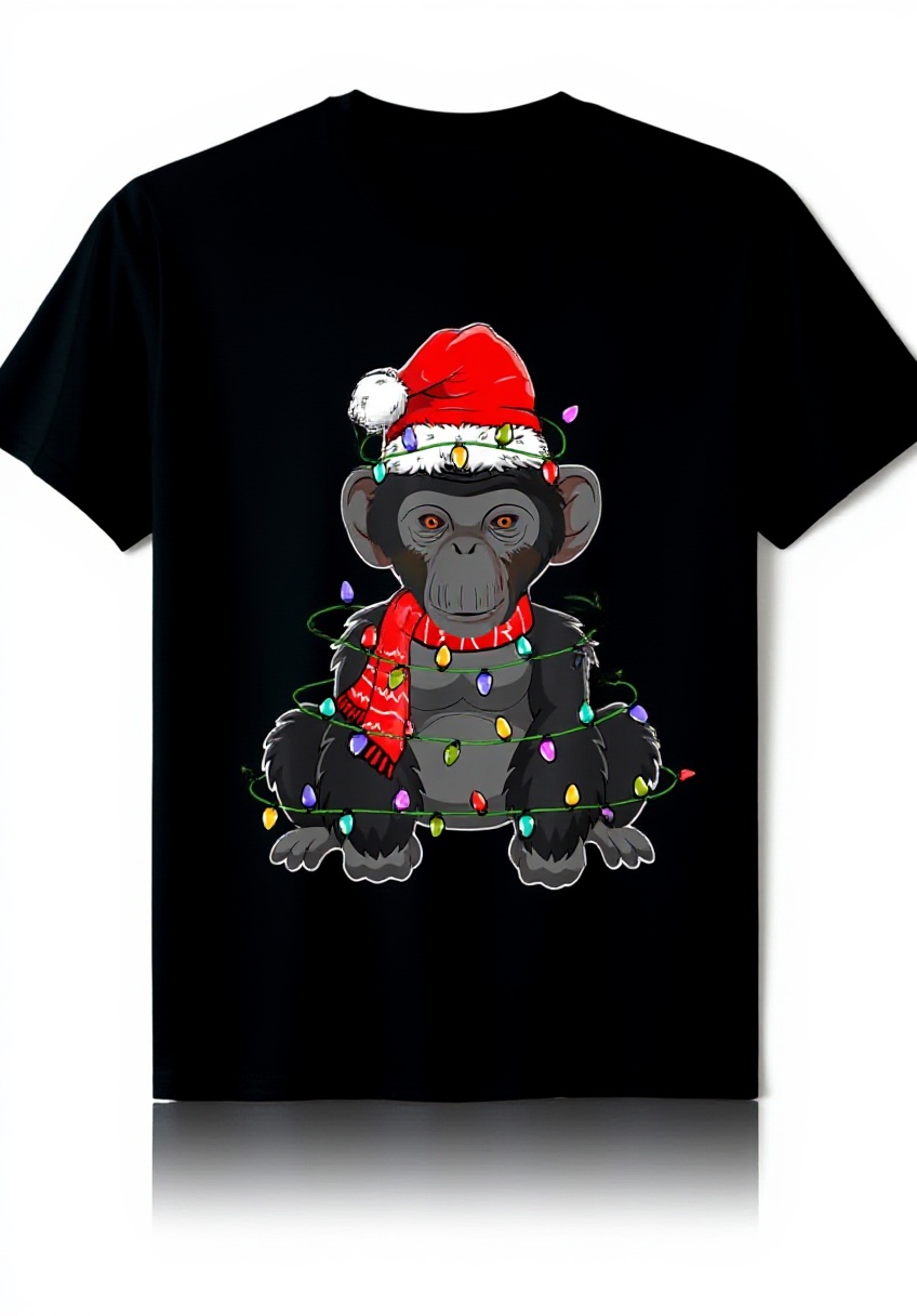 Ce t-shirt fantaisie présente un design unique mettant en scène un bonobo arborant un chapeau de Père Noël et entouré de guirlandes lumineuses festives. Confectionné dans un tissu léger avec une coupe classique, il offre un confort optimal grâce à ses manches à double couture et son ourlet renforcé à la base.
