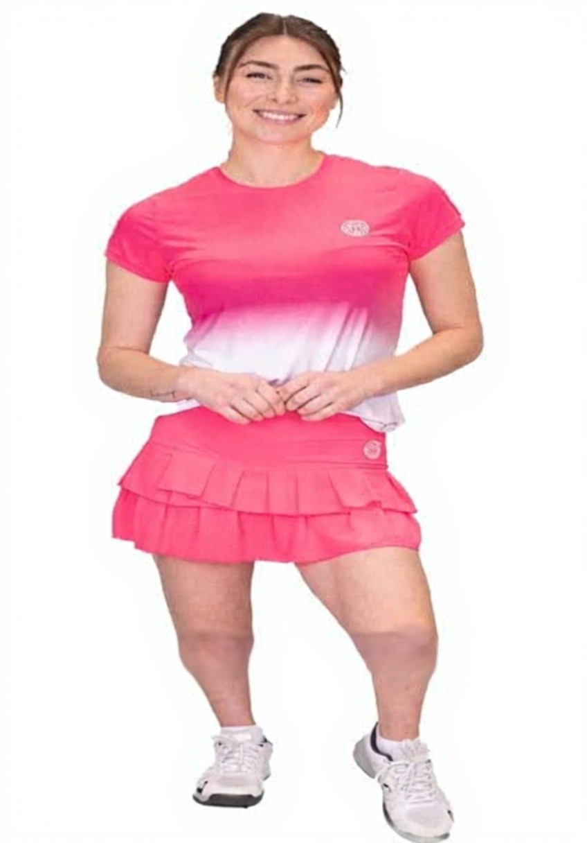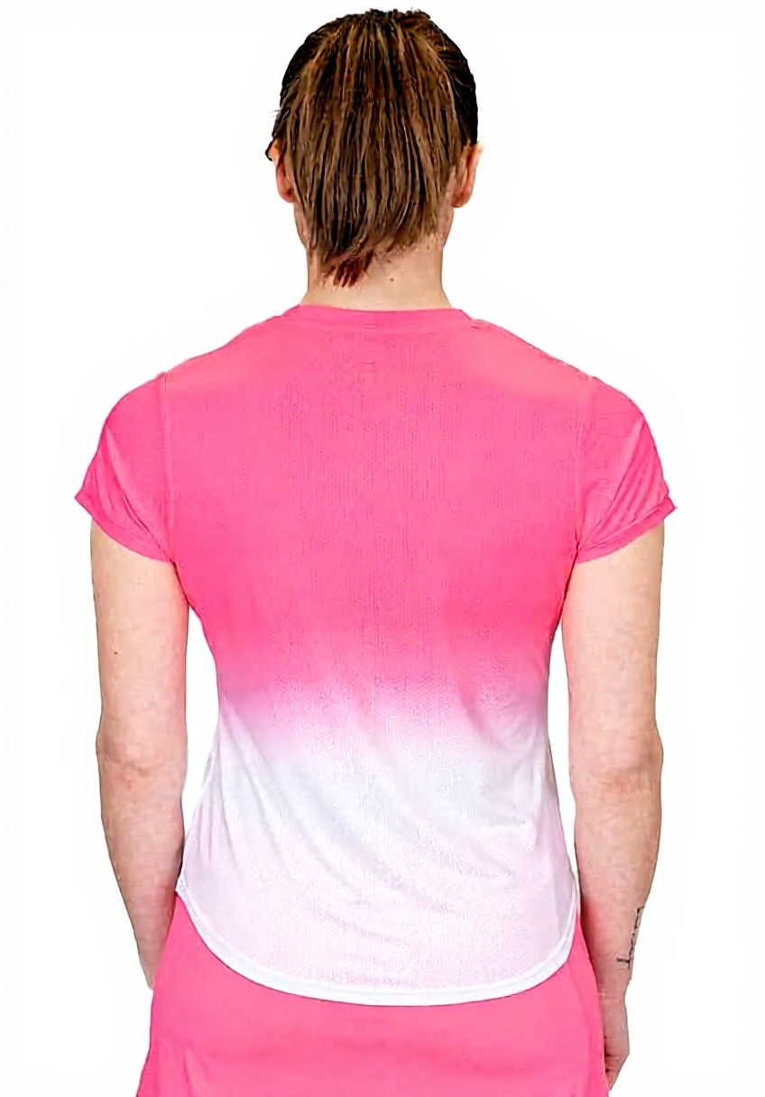 Ce t-shirt BIDI BADU pour femmes combine élégance et fonctionnalité avec son design dégradé rose et blanc. Fabriqué en maille de polyester et élasthanne, il assure une respirabilité optimale et une grande liberté de mouvement, parfait pour les activités sportives intenses.