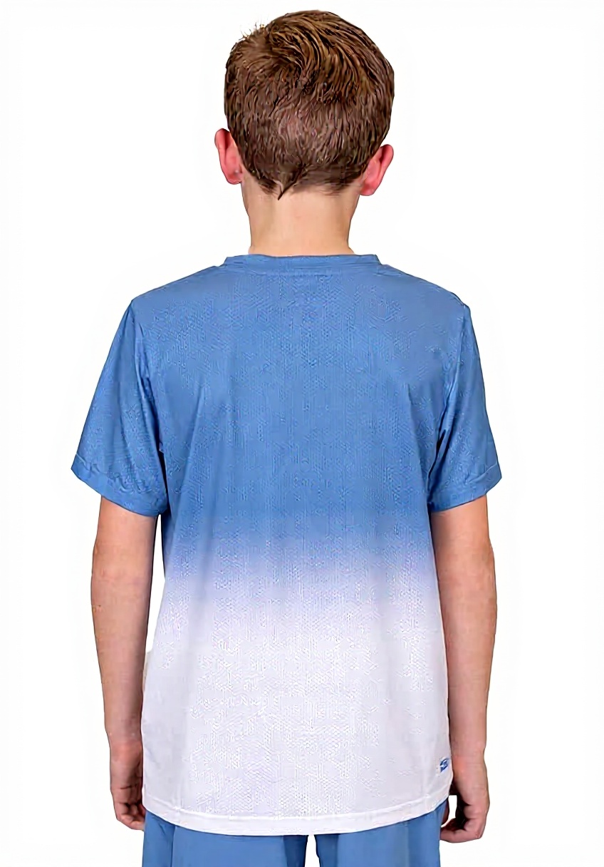 Ce T-shirt BIDI BADU pour garçons allie esthétique et fonctionnalité avec son design dégradé bleu-blanc et sa composition en 92% polyester et 8% élasthanne. Conçu spécifiquement pour le tennis, il offre une respirabilité optimale et une coupe adaptée aux mouvements dynamiques, tout en maintenant sa forme après de multiples lavages.